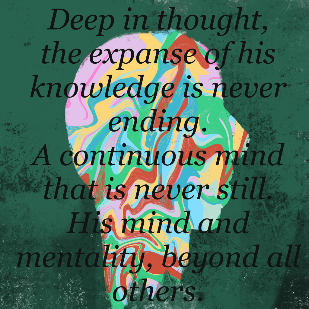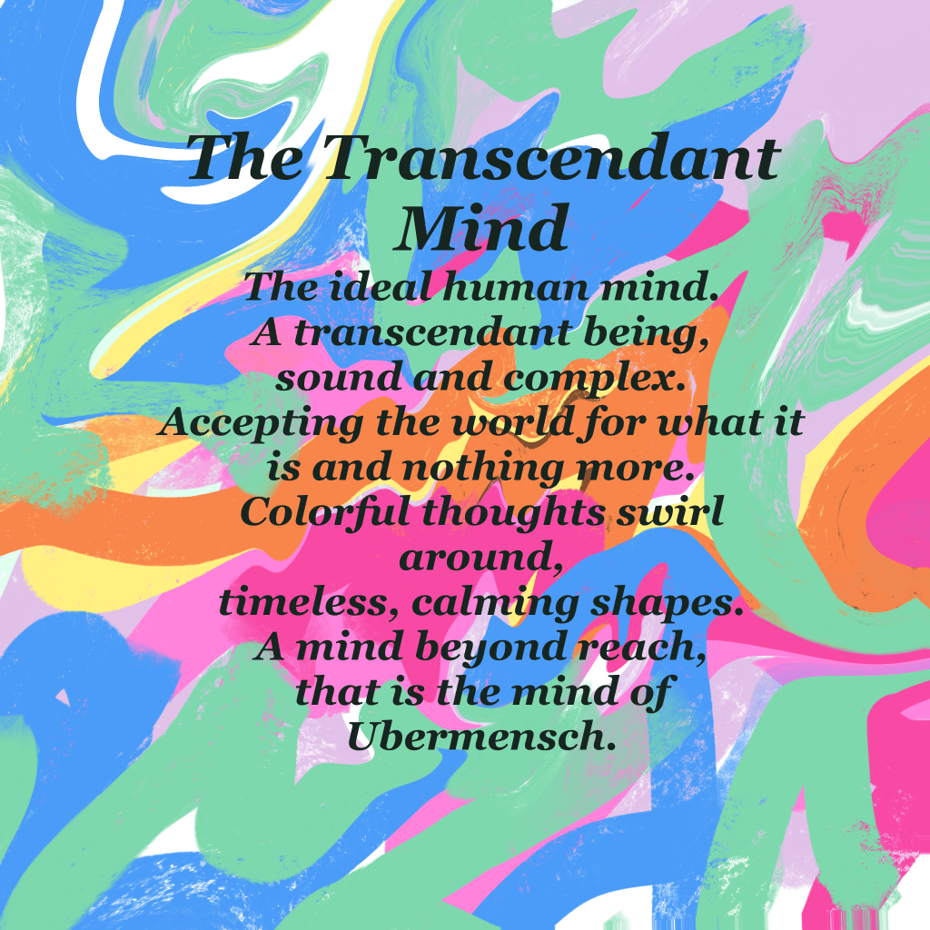 The second poem is a bit more abstract as it relates to the symbolism in the original artwork where the artist uses colorful, swirling fractals engulfing a white face to represent Ubermensch’s busy and complex mind. It shows the true expanse and complexity if Ubermensch’s mental state. Therefore, it is a deeper and more abstract analysis of Ubermensch’s mind.